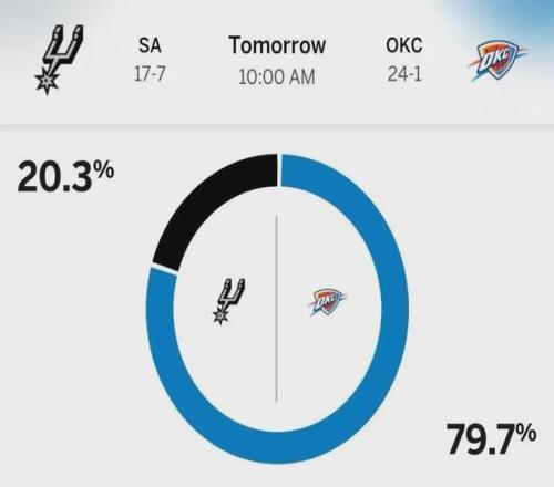 話說ESPN并不看好擁有文班亞馬的馬刺,可以戰勝幾乎不可擊敗的雷霆,兩隊勝率預測如下: