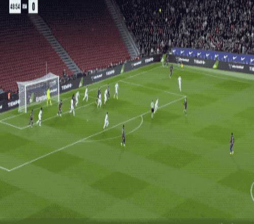 上半場結束,兩隊互交白卷。兩隊射門13-2,但巴薩只有2次射正,縱然擁有81%的控球率,也無法破門。