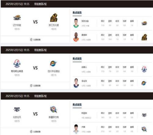 第二輪比賽將會在12月15日和16日進行,其中焦點賽事有,15日晚上,遼寧男籃主場迎戰廣廈男籃,這絕對是總冠軍級別的較量,不容錯過。北京男籃坐鎮主場迎戰新疆男籃,看趙睿對付老東家了。16日晚上,值得關注的比賽有南京同曦回到主場對陣上海男籃,看看郭昊文是否還能如此勇猛。浙江男籃坐鎮主場迎戰廣東男籃,丁偉力拼首勝了。