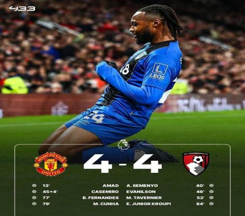 下半場,伯恩茅斯短時間內(nèi)由埃瓦尼爾森、塔韋尼耶連入兩球,B費任意球直接破門追成3-3。隨后,庫尼亞進球,曼聯(lián)4-3反超比分。克魯皮替補登場,為客隊再度扳平比分。最終曼聯(lián)4-4伯恩茅斯。一場進球大戰(zhàn)后,雙方4-4平分秋色。