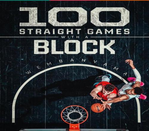在比賽進行到第三節中段時,文班亞馬血帽戴森-丹尼爾斯的上籃,他一把將對方的投籃扇到了計時器上,這也讓文班連續100場比賽有蓋帽入賬,他也成為達成該成就的歷史第三人。在他之前的兩位球員是帕特里克-尤因(145場)和迪肯貝-穆托姆博(116場)。