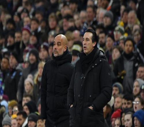 曼城隊(duì)主教練瓜迪奧拉(左)與阿斯頓維拉隊(duì)主教練埃梅里在場邊觀戰(zhàn) 新華社/美聯(lián)