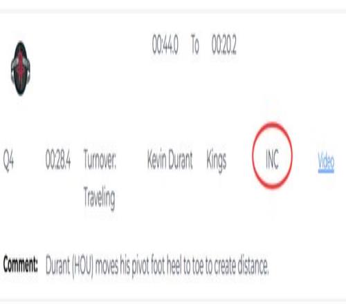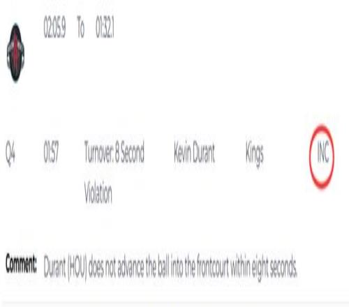 第一次是漏判,發生在距離第四節結束還有1分57秒,裁判報告指出,火箭的杜蘭特未在8秒內將球推進前場。這是一次漏吹的8秒違例,火箭獲利,國王吃虧。