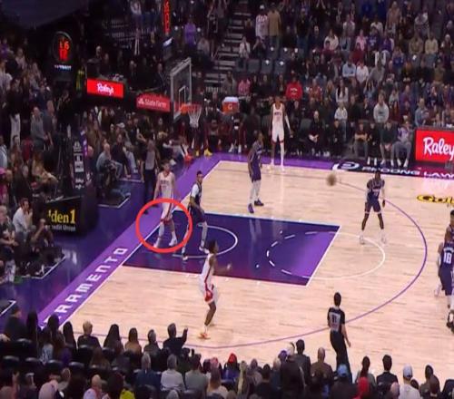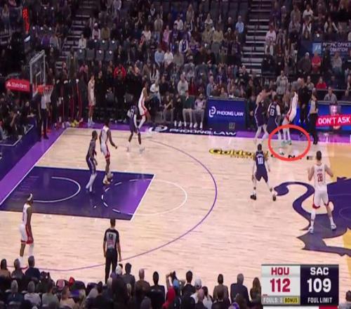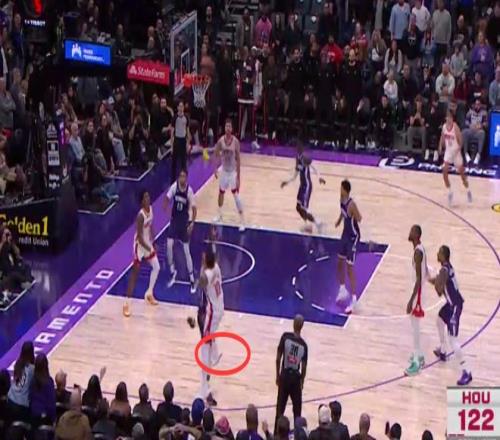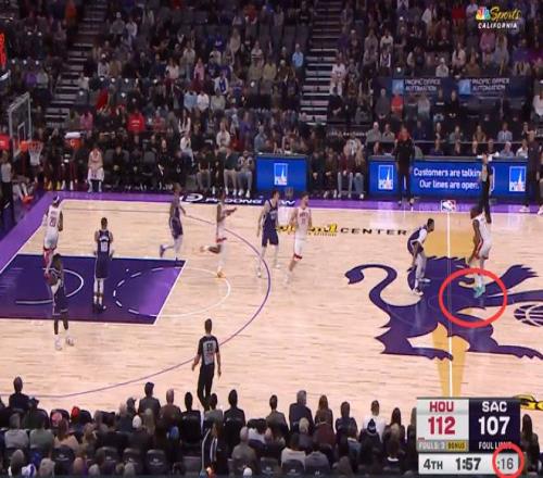 第三次也是漏判,發生在距離第四節結束還有28.4秒,杜蘭特在創造空間時移動中樞腳,這是一次漏吹的走步違例,火箭獲利,國王吃虧。