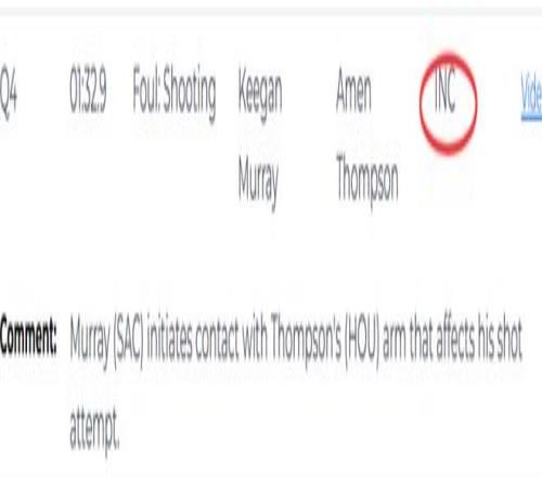 第二次是漏判,發生在距離第四節結束還有1分32秒,國王的穆雷在防守時與火箭的湯普森的手臂發生接觸,干擾了后者的投籃動作,這應該吹防守犯規。這次漏判是國王獲利,火箭吃虧。