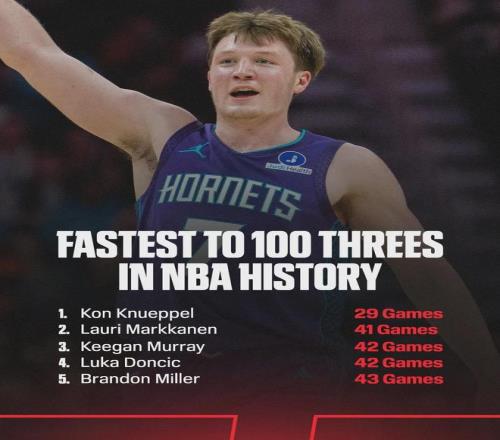 這個是NBA生涯前100記三分,此前紀錄是馬爾卡寧的41場,如今克尼佩爾比他少用了12場。克尼佩爾新秀賽季11次單場以三項命中率50%/40%/90%砍下20+,追平庫里的紀錄,并列NBA歷史第一。再達成一場,就將超越庫里!