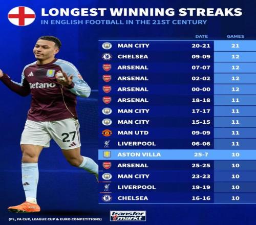 北京時間12月23日,德轉統計出了本世紀英超俱樂部各項賽事的連勝紀錄,曼城以21連勝高居第一,剛剛豪取10連勝的阿斯頓維拉則取得了英超俱樂部歷史并列第四長的連勝紀錄。