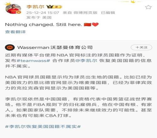 李凱爾及其經(jīng)紀公司沃瑟曼體育公司于2025年12月24日發(fā)布聲明:否認李凱爾恢復(fù)美國國籍的傳聞。