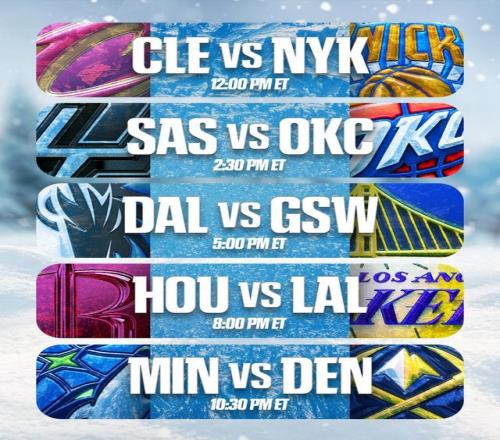 今年的圣誕大戰一共有5場,分別是騎士vs尼克斯、雷霆vs馬刺、獨行俠vs勇士、火箭vs湖人、森林狼vs掘金。