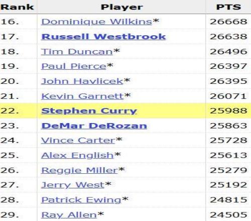 目前排在他身前的是森林狼和綠軍名宿凱文-加內特,庫里預計在近幾場比賽中就將完成超越。
