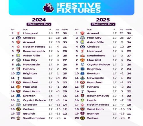北京時間12月25日,德轉(zhuǎn)列出了2024年和2025年圣誕節(jié)當天的英超積分榜,巧合的是,利物浦和阿森納以相同的積分以及凈勝球分別排名第一。與上賽季同期相比,阿森納(+6分)、曼城(+10分)、阿斯頓維拉(+8分)以及曼聯(lián)(+4分)成績均有提升。