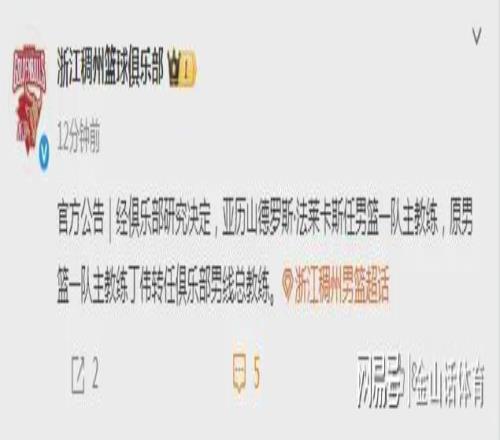 昨天,浙江男籃俱樂部官方宣布:“經(jīng)俱樂部研究決定,亞歷山德羅斯·法萊卡斯任男籃一隊主教練,原男籃一隊主教練丁偉轉任俱樂部男籃總教練。”。至此,近日炒得沸沸揚揚的丁偉“下課”傳聞,正式“靴子落地”。CBA江湖的“救火教練”丁偉,又一次從主教練崗位上下崗。