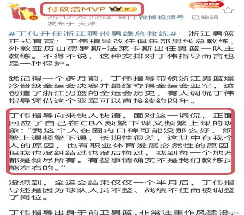 對于“丁團長”來講,這已經(jīng)是他第8次從主教練崗位上下崗了。2010年:擔任浙江隊主帥,最后下崗;2015年:再度擔任浙江隊主帥,不久后下崗;2016年:擔任同曦隊主帥,不久后下崗;2017:擔任北控隊主帥,然后下崗;2020年:擔任廣州隊主帥然后下崗;2020年9月:擔任山西隊主帥,然后下崗;2023:擔任山東隊主帥,然后下崗;2025年,再次重返浙江隊任球隊主帥,如今又下課。