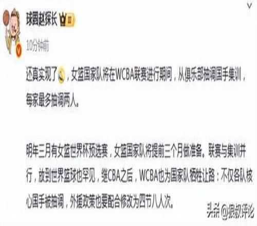 明年三月有女籃世界杯預選賽,女籃國家隊將提前三個月做準備。聯(lián)賽與集訓并行,放到世界籃球也罕見,繼CBA之后,WCBA也為國家隊犧牲讓路:不僅各隊核心國手被抽調,外援政策也要配合修改為四節(jié)八人次。