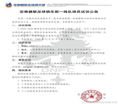 其中,位于中甲的定南贛聯,順利出現在了首批完成清償名單中。隨后,他們迅速發布了一線隊球員試訓公告,啟動了新賽季球員遴選工作。