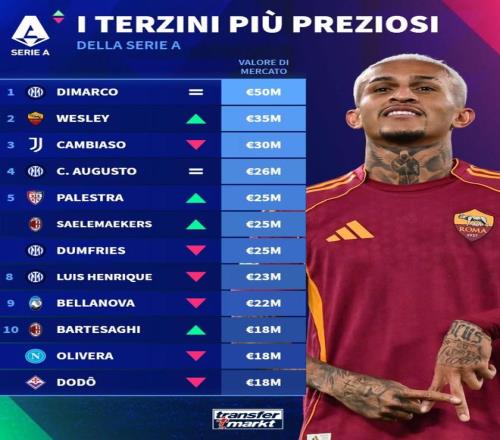 北京時間12月25日,在更新了意甲球員的身價后,德轉列出了目前意甲邊后衛身價排名前10的球員,迪馬爾科5000萬歐元高居第一,韋斯利-利馬3500萬歐元第二,安德烈亞-坎比亞索3000萬歐元第三。