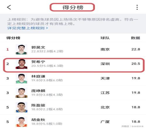 上場時間聯盟第一,讓我們不妨看看賀希寧的場上數據。截止常規賽前6輪,賀西寧場均得分20.5分,還有5個籃板4.5次助攻進賬。三項數據均創造了職業生涯新高。打青島隊,他砍下24分6籃板2助攻;打吉林隊,他砍下11分5籃板1助攻;打寧波隊,他砍下15分3籃板3助攻;打北京隊,他砍下27分5籃板4助攻;打山東隊,他砍下25分3籃板4助攻;打四川隊,他砍下21分8籃板12助攻的準三雙。而賀西寧場均20.5分,也排在本土球員第2位。