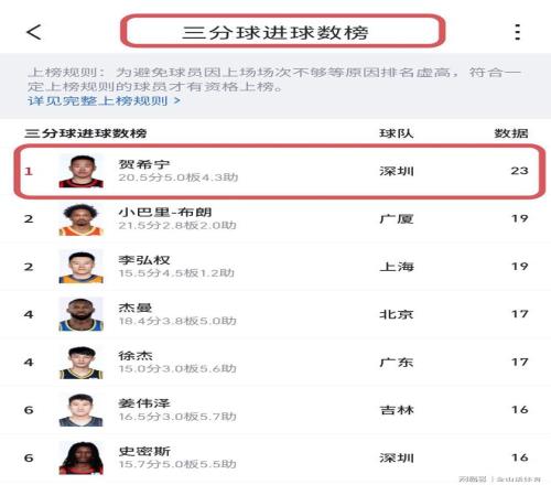 值得一提的是,除了上場時間和得分在全聯盟名列前茅,賀西寧還有一項數據,排在全聯盟第一位,那就是他的三分球命中數。截止常規賽前6輪,賀西寧總共投進了23記三分,遙遙領先于所有CBA球員,排在全聯盟第一位。更恐怖的是,賀西寧的三分命中率高達40%,同樣創下他職業生涯新高。
