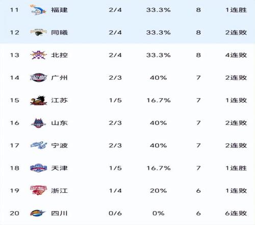 隨著天津隊拿下首場勝利之后,聯盟全敗球隊僅剩四川隊,這支昔日總冠軍也是唯一一支開局6連敗的球隊,排名從倒數第二重回倒數第一。