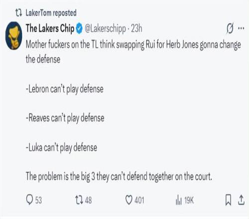 當(dāng)詹姆斯、里夫斯、東契奇三個(gè)核心都不能防守時(shí),難道就交易得到一個(gè)3D側(cè)翼就能完全改變球隊(duì)體系嗎?明顯是癡人說夢(mèng)。