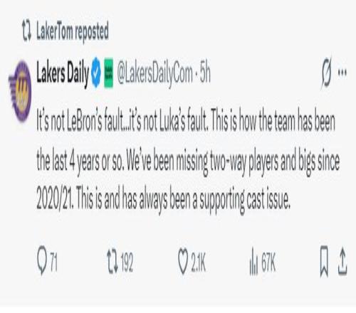 北京時(shí)間12月27日晨,湖媒Lakers Daily發(fā)聲:這不是詹姆斯的錯(cuò)也不是東契奇的錯(cuò),過去四年湖人一直都是這個(gè)樣子,從20-21賽季開始我們就缺少攻防雙向球員與中鋒,替補(bǔ)陣容的問題尤為明顯。
