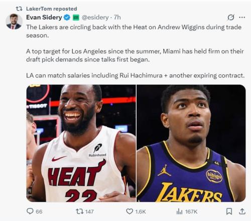 根據(jù)NBA記者埃文-斯迪瑞寫道:湖人隊(duì)已經(jīng)重啟了跟熱火隊(duì)的談判,湖人依舊想要得到安德魯-威金斯。自今夏開始,湖人一直都在努力的交易得到維金斯,但邁阿密一直要求得到未來選秀權(quán)與年輕資產(chǎn),湖人希望用八村壘+添頭去換威金斯,這使得交易陷入僵局。