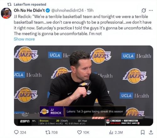 在湖人慘敗火箭賽后雷迪克暴怒,他直指隊(duì)內(nèi)某些球員的工作做得不到位,而且沒有贏球的欲望,說一套做一套,雷迪克的言論讓湖人內(nèi)部的矛盾擺上臺(tái)面。很多球迷開始炮轟詹姆斯、東契奇、里夫斯、艾頓、八村壘、雷迪克。