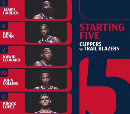 首發陣容方面,快船隊這邊,祖巴茨、比爾缺陣,泰倫盧教練排出的最新首發五人組為:詹姆斯-哈登、克里斯-鄧恩、科懷-倫納德、約翰-科林斯、大洛佩茲;開拓者隊這邊,亨德森、格蘭特、霍勒迪、利拉德四大主力缺陣,首發陣容則為:夏普、卡馬拉、默里、阿夫迪亞、克林根。