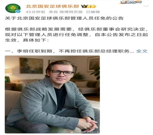 北京時間2025年12月27日消息。2025年即將過去,在獲得中超聯賽第4名,以及足協杯冠軍之后,北京國安的一整年賽程全部收官。今天上午10點,國安官宣:李明不再擔任俱樂部的總經理。