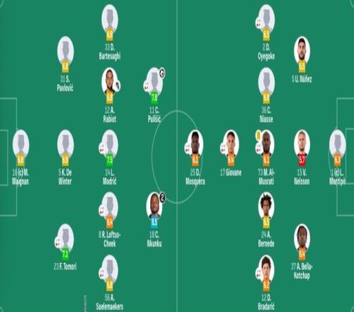 AC米蘭首發:16-邁尼昂、23-托莫里(86'27-奧杜古)、31-帕夫洛維奇、5-德溫特、14-莫德里奇(70'30-亞沙里)、12-拉比奧特、8-奇克(70'19-弗法納)、56-薩勒馬科爾斯(76'24-阿特卡梅)、33-巴特薩吉、18-恩昆庫、11-普利希奇(76'4-里奇)