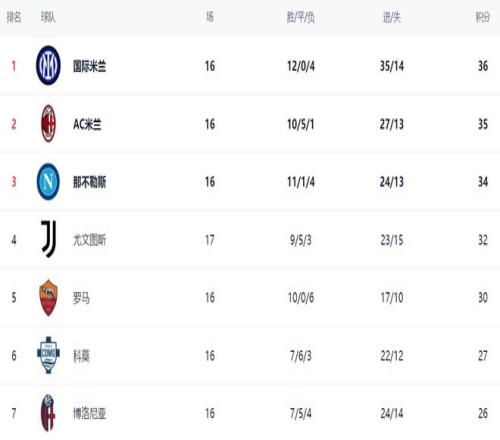 在積分榜上,國際米蘭以36分排名榜首。第2名的是AC米蘭,拿到35分,只落后1個積分。第3名的是那不勒斯,拿到34分,緊隨其后。尤文圖斯以32分排名第4。前4最多只差4分,榜首之爭非常亂,每輪比賽過后都有可能導致榜首發生變化。羅馬以30分排名第5,在爭冠集團中有點掉隊??颇?7分排第6。第7的是博洛尼亞,拿到26分。拉齊奧以24分排名第8。