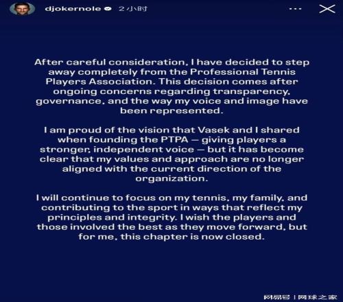 “經(jīng)審慎考慮,我決定完全退出職業(yè)網(wǎng)球運(yùn)動(dòng)員協(xié)會(huì)(PTPA)。作出此決定,源于我長(zhǎng)期以來對(duì)協(xié)會(huì)透明度、管理運(yùn)作,以及自身觀點(diǎn)與形象被呈現(xiàn)方式的諸多顧慮。