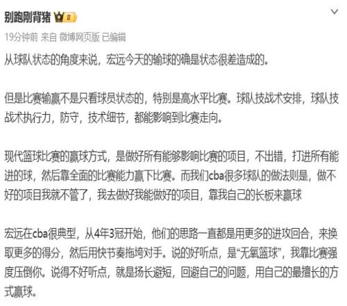 別跑剛背豬認(rèn)為:從球隊(duì)狀態(tài)的角度來(lái)說,宏遠(yuǎn)今天的輸球的確是狀態(tài)很差造成的。宏遠(yuǎn)是典型的靠長(zhǎng)板來(lái)贏球,從4年3冠開始,他們的思路一直都是用更多的進(jìn)攻回合,來(lái)?yè)Q取更多的得分,然后用快節(jié)奏拖垮對(duì)手。說的好聽點(diǎn),是“無(wú)氧籃球”,我靠比賽強(qiáng)度壓倒你。說得不好聽點(diǎn),就是揚(yáng)長(zhǎng)避短,回避自己的問題,用自己的最擅長(zhǎng)的方式贏球。