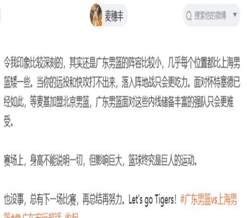 麥穗豐認(rèn)為,廣東隊(duì)這場(chǎng)比賽就是輸在了尺寸上:令我印象比較深刻的,其實(shí)還是廣東男籃的陣容比較小,幾乎每個(gè)位置都比上海男籃矮一些。當(dāng)你的遠(yuǎn)投和快攻打不出來(lái),落入陣地戰(zhàn)只會(huì)更吃力。面對(duì)懷特塞德已經(jīng)如此,等麥基加盟北京男籃,廣東男籃面對(duì)這些內(nèi)線儲(chǔ)備豐富的強(qiáng)隊(duì)只會(huì)更難受。賽場(chǎng)上,身高不能說明一切,但影響巨大,籃球終究是巨人的運(yùn)動(dòng)。