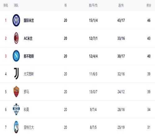 這場(chǎng)比賽也影響了爭(zhēng)冠格局。國(guó)際米蘭依然占據(jù)榜首位置,戰(zhàn)績(jī)是15勝1平4負(fù),拿到46分。AC米蘭贏球之后,總積分是43分,排名第2。前2的球隊(duì)之間相差3分。顯然,國(guó)際米蘭和AC米蘭這兩支球隊(duì)是奪冠大熱門(mén)。衛(wèi)冕冠軍那不勒斯有些掉隊(duì)了,只拿到40分排名第3。尤文圖斯則以39分排名第4。