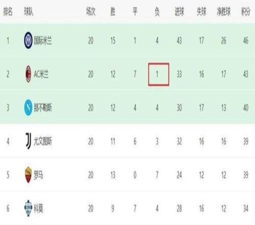隨著本場比賽AC米蘭在客場完成逆轉,在本賽季意甲20輪戰罷的情況下,紅黑軍團取得12勝7平1負的戰績,目前僅落后榜首的國際米蘭3分。要知道,這是球隊自1994/95賽季意甲啟用三分制以來,AC米蘭歷史上第三次做到前20輪只輸1場,前兩次分別是1995/96賽季和2003/04賽季,而那兩個賽季,米蘭最終都捧起了聯賽冠軍獎杯。按照這一規律來看,本賽季意甲冠軍正在向紅黑軍團招手。