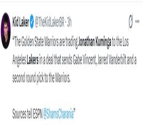 根據(jù)Shams的說法,聯(lián)盟已經(jīng)有4-5支球隊表達了庫明加的興趣,獨行俠、熱火、湖人等球隊已經(jīng)公開追逐庫明加,庫明加的經(jīng)紀人透露他愿意被交易到邁阿密,庫明加已經(jīng)連續(xù)13場比賽被DNP,他申請交易后他已經(jīng)進入離隊倒計時,不過勇士管理層覺得可能在今夏交易他收益最大。
