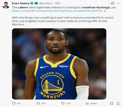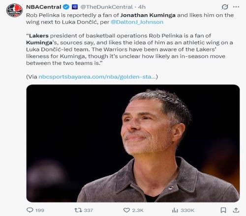 BR記者杰克-費舍爾透露,湖人隊在2025年的交易截止日前就已經(jīng)開始關注庫明加,因為他們需要側翼球員的支持。湖人隊急需運動能力出眾的側翼已經(jīng)是眾所周知的消息,湖人非常看重庫明加這位身體素質出色的3-4號位。去年夏天湖人在庫明加跟勇士鬧矛盾時就已經(jīng)詢價過,湖人對庫明加的興趣已經(jīng)持續(xù)了一年。