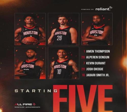 火箭這邊,伊森、范喬丹和芬尼-史密斯因傷休戰,雷霆中鋒哈滕繼續缺陣?;鸺緢鍪装l:阿門-湯普森、奧科吉、杜蘭特、小賈巴里-史密斯、申京。雷霆首發:亞歷山大、阿隆-維金斯、多爾特、杰倫-威廉姆斯、切特-霍姆格倫。