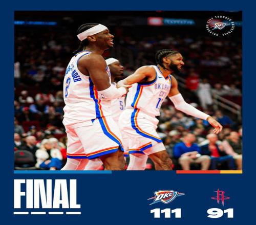 烏度卡請求暫停,隨后出現技術犯規,亞歷山大罰球命中。戴維森遠投不進,亞歷山大封蓋謝潑德,隨后4罰3中。距離終場不足3分球,火箭落后20分并換上板凳席末端的球員,休斯頓提前棄子認負,比賽就此失去了懸念。最終,雷霆以111比91完勝火箭。OKC本賽季雙殺休斯頓,得以豪取5連勝。休斯頓單節16比34落后,末節崩盤?;鸺藨?1分創下了球隊賽季得分的最低。此役,火箭搶下60個籃板,其中23個前場籃板,但3分球24投7中,外線瘋狂打鐵。雷霆全隊44個籃板,其中前場籃板7個。