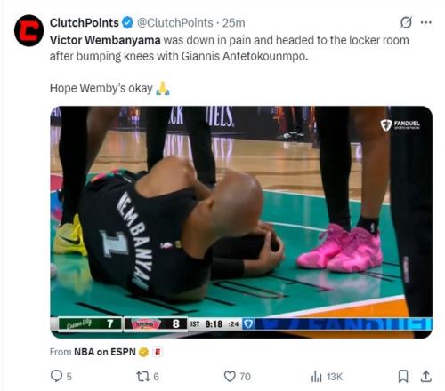 開場2分鐘光頭文班亞馬就在一起防守中跟揚尼斯的膝蓋發(fā)生碰撞,文班亞馬倒地不起,隨后文班亞馬下場檢查。字母哥毫發(fā)無損單節(jié)6分37秒,5中4+三分1中1+罰球6中5拿到14分2籃板1助攻2搶斷,字母哥在場時還領(lǐng)先1分。