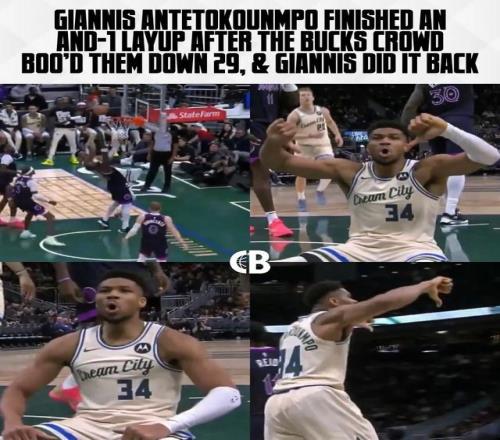 那場比賽半場結束球員回到更衣室時,字母哥被主場觀眾狂噓,一點面子都不給。下半場回來字母哥打成一個2+1之后,字母哥坐在地上對著主場的球迷噓了回去,同時兩個大拇指朝下,以眼還眼以牙還牙。