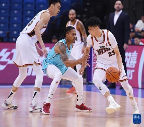 1月15日,青島嶗山啤酒隊球員段昂君(左)在比賽中防守吉林長白山恩都里隊球員摩爾。新華社記者 李紫恒 攝
