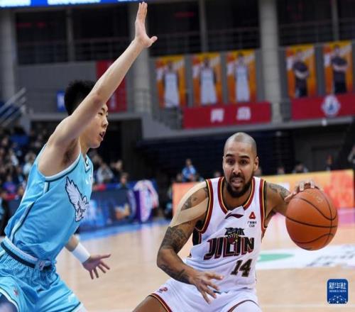 1月15日,吉林長白山恩都里隊球員威爾遜(左)在比賽中防守青島嶗山啤酒隊球員米奇。新華社記者 李紫恒 攝