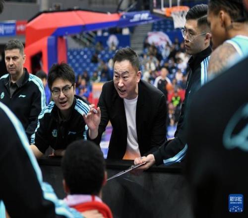 1月15日,青島嶗山啤酒隊主教練劉維偉(中)在比賽中向隊員布置戰術。新華社記者 李紫恒 攝