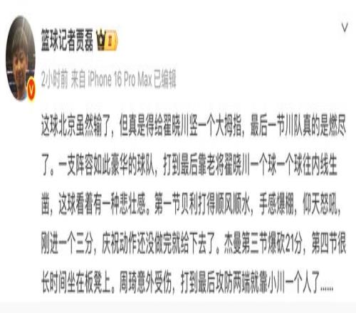 賈磊這段文字既是對老將翟曉川的夸獎,也是對北京教練組使用外援辦法的不滿,此役杰曼砍下29分,第三節轟下21分,貝利則入賬11分,北京隊內只有3人得分上雙,另外一人是翟曉川的15分。