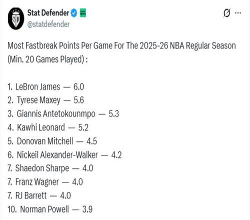 北京時(shí)間1月17日,據(jù)Stat Defender的數(shù)據(jù)顯示,在全聯(lián)盟本賽季至少出戰(zhàn)20場(chǎng)比賽的所有球員中,詹姆斯的場(chǎng)均快攻得分(6.0分)排在第一位,馬克西和字母哥分列二三。具體排名如下,括號(hào)內(nèi)為場(chǎng)均快攻得分——