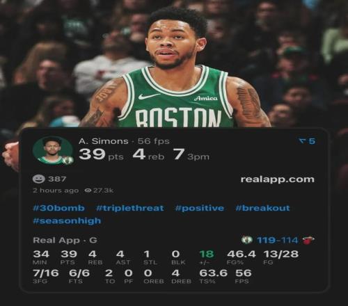凱爾特人119-114戰(zhàn)勝熱火,完成19分大逆轉(zhuǎn)。凱爾特人后衛(wèi)安芬尼-西蒙斯替補(bǔ)出戰(zhàn)34分鐘,投籃28中13,三分16中7,罰球6中6,爆砍39分4籃板4助攻1搶斷,正負(fù)值+18全場(chǎng)第二高!得分創(chuàng)造個(gè)人賽季新高,此前紀(jì)錄只有27分。