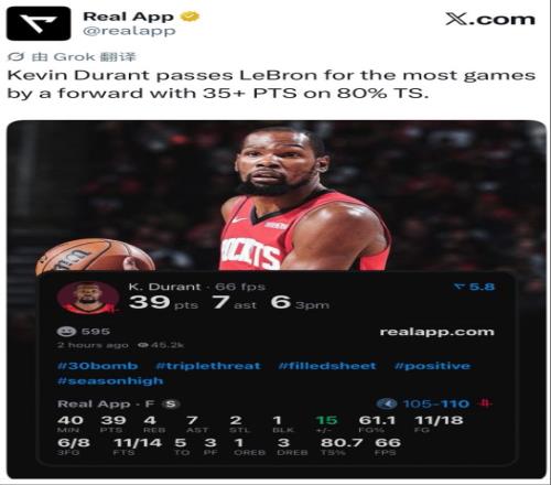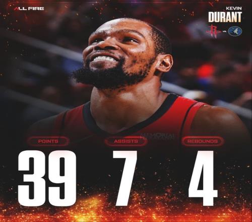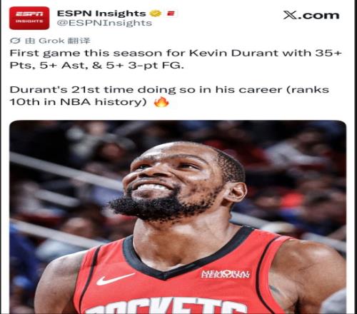 3.這是杜蘭特火箭生涯首次35+5+5三分的場(chǎng)次;