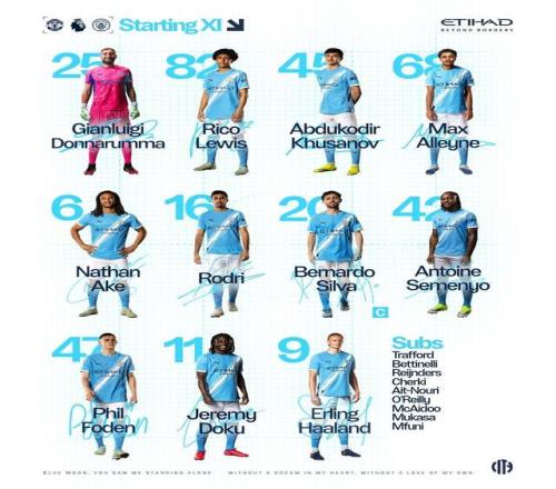 曼城首發:25-多納魯馬、68-阿萊恩、45-胡桑諾夫、82-里科-劉易斯、6-阿克、47-福登、16-羅德里、20-伯納多-席爾瓦、11-多庫、42-塞門約、9-哈蘭德
